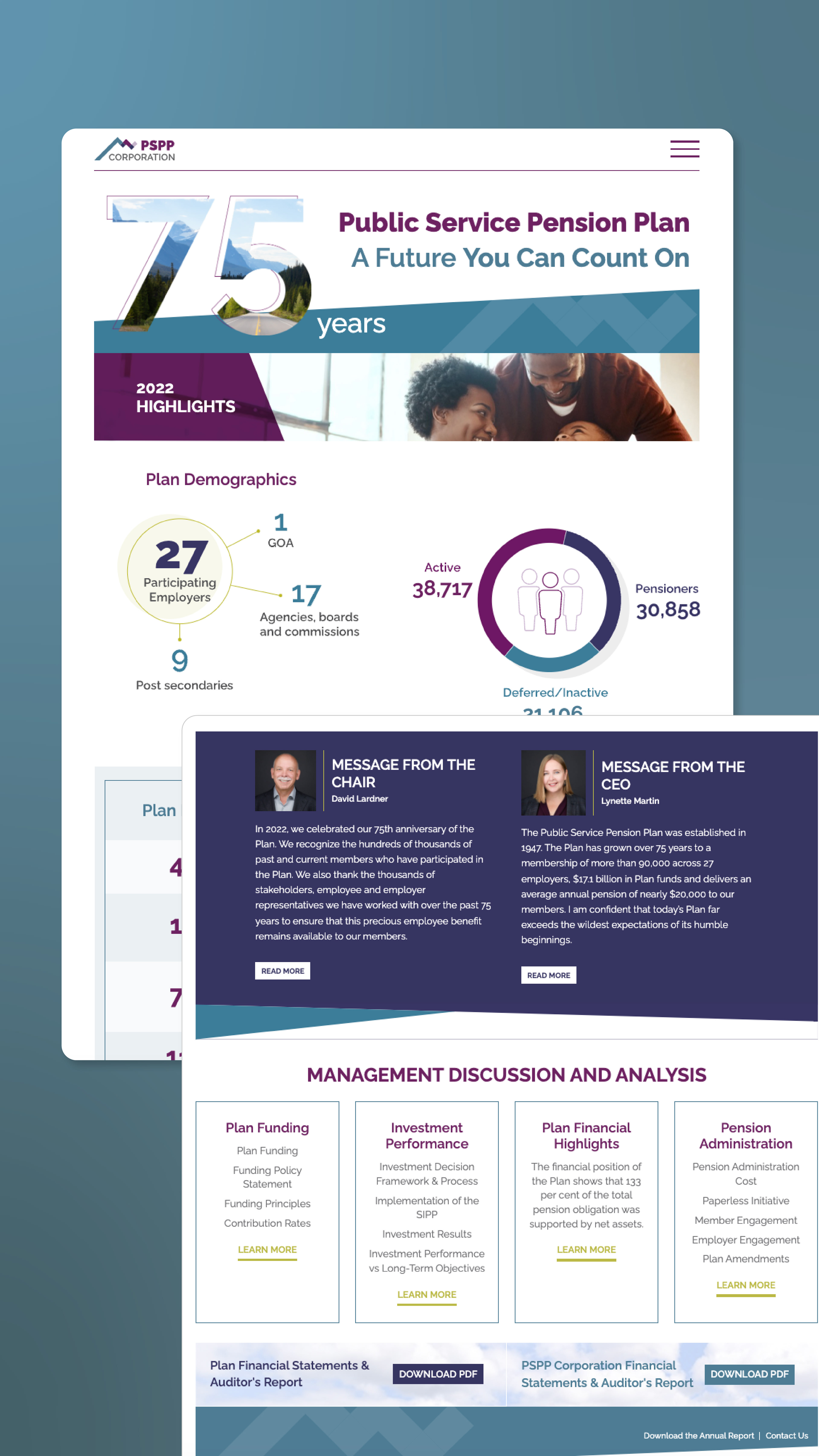 Along with the creative team at Vision Creative Inc., I was tasked with designing the fully digital 2022 annual report for the Public Service Pension Plan (PSPP). This year’s report marked the plan’s 75th anniversary and centered around the theme “A Future You Can Count On.” The project involved creating visually engaging layouts that adhered to PSPP’s brand guidelines, with select information presented in infographic format to enhance accessibility and reader interest.