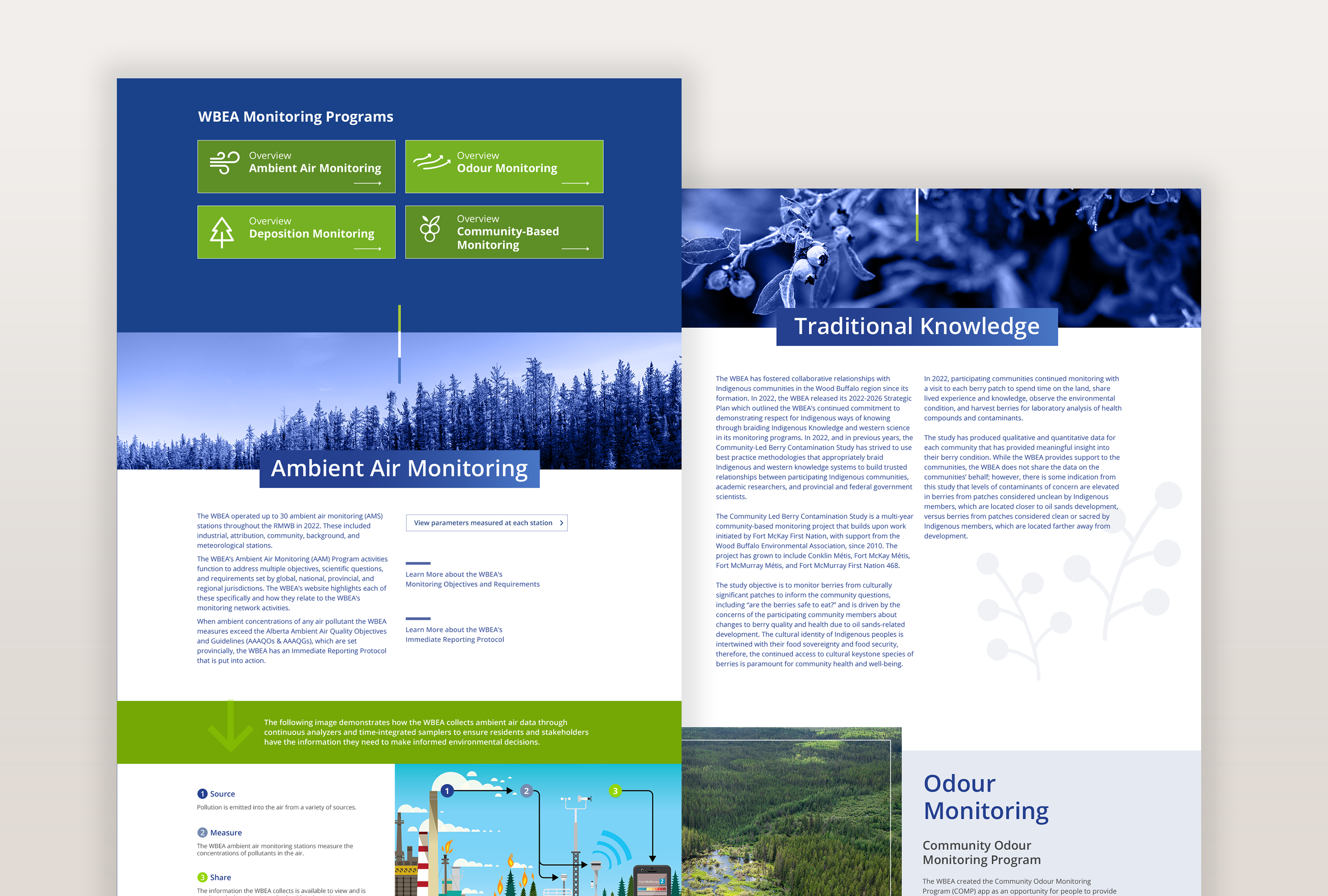 The WBEA is a multi-stakeholder, consensus-based, not-for-profit organization that leads in state-of-the-art environmental monitoring for the Regional Municipality of Wood Buffalo. As a senior graphic designer at Vision Creative, I contributed to the WBEA 2022 annual report website, a digital platform for sharing complex environmental data in a clear, accessible way. Collaborating with a creative team, I designed user-friendly layouts that balanced technical content with visual clarity, ensuring a seamless and engaging experience that aligned with WBEA’s brand.